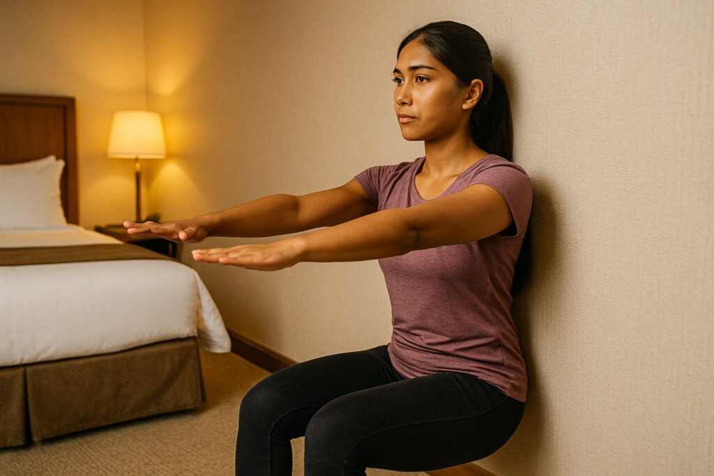 Hotel walls provide a solid surface for numerous resistance workouts that emphasize strength and stability.